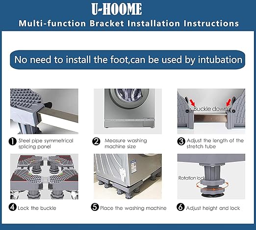 • The washing machine base is adjustable between 41-64cm in length and width and 9-12cm in height. It is a telescopic base that can be adjusted vertically and horizontally to suit different sizes of washing machines